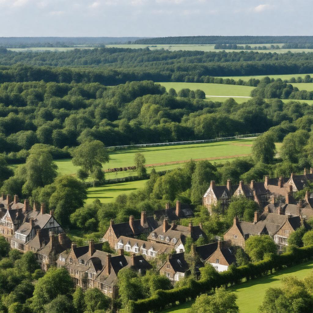"Generate an image of a charming English town with a horse racing track in the background, featuring lush green landscapes and elegant buildings, representing Ascot, a town in Berkshire, England, known for the Royal Ascot and Ascot Racecourse."