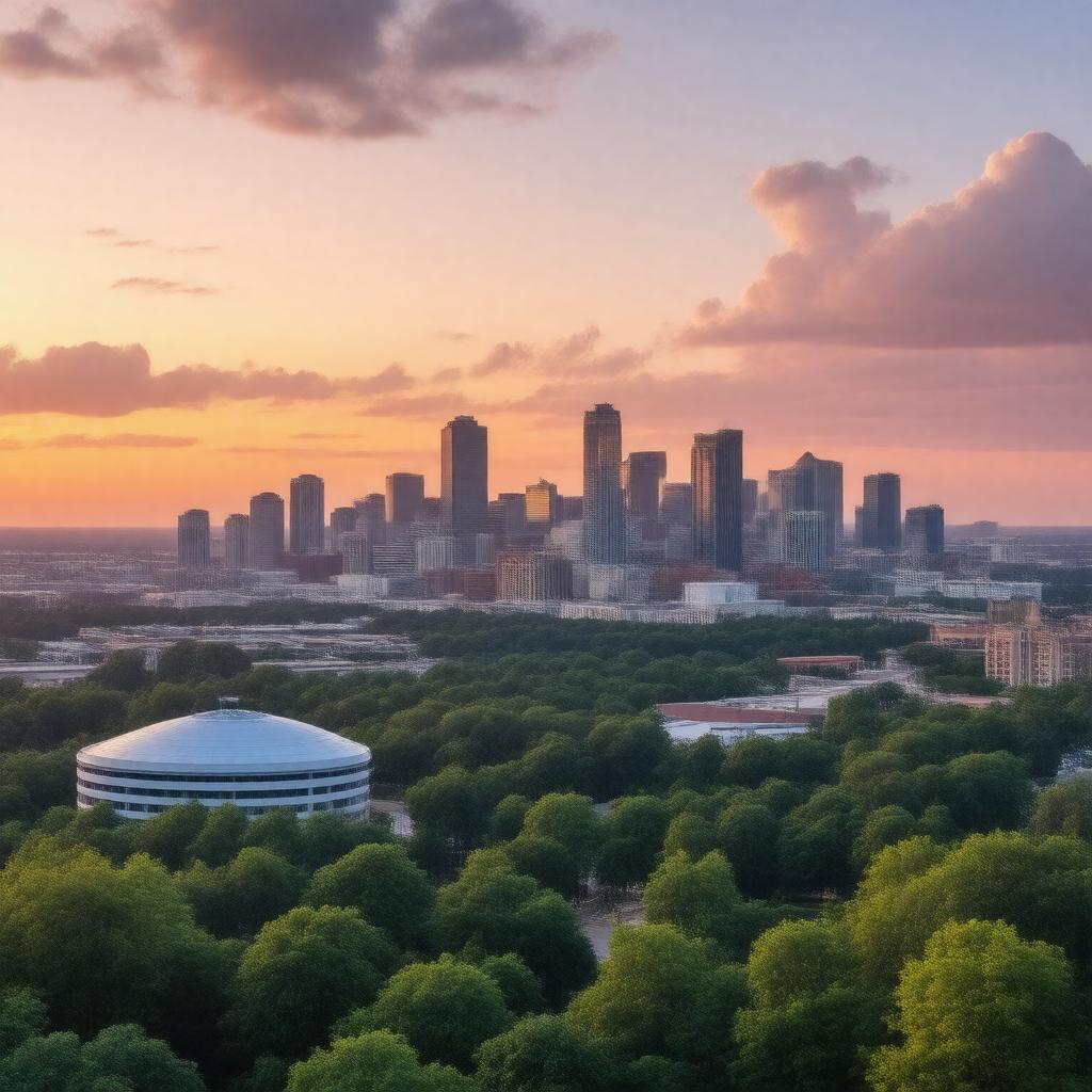 "Generate an image of a vibrant cityscape at sunset, showcasing the Atlanta skyline with notable landmarks such as the Georgia Aquarium, World of Coca-Cola, and Centennial Olympic Park in the background, with Piedmont Park and the Atlanta Botanical Garden in the foreground, depicting the city's nickname 'The City in a Forest', in a realistic and colorful style."