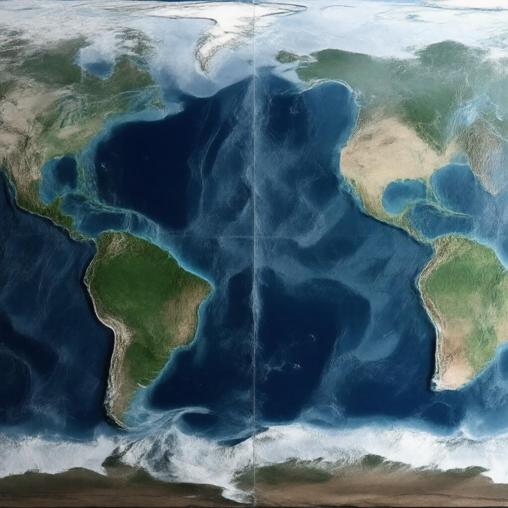 "Generate a realistic, wide-angle view of the Atlantic Ocean basin, showcasing its vast expanse with the Mid-Atlantic Ridge in the distance, surrounded by the coastlines of North America, South America, Europe, Africa, and Antarctica. Include various geographical features such as islands, an abyssal plain, a submarine canyon, and mountainous terrain. The image should also subtly highlight the Sargasso Sea, Caribbean Sea, Gulf of Mexico, and Labrador Sea within the basin. Incorporate a sense of depth with North Atlantic Deep Water and South Atlantic Deep Water. Use a photorealistic style with accurate depictions of oceanic and geological elements."