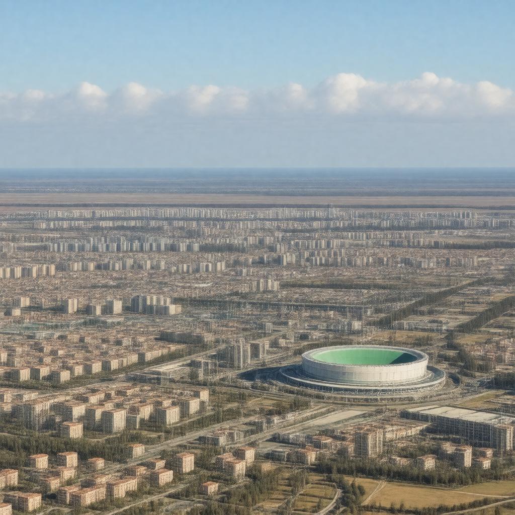 "Generate a realistic image of Atyrau, a city located in western Kazakhstan, near the Caspian Sea and the Ural River, with a semi-arid climate, featuring a mix of modern and industrial architecture, oil facilities, and a football stadium, under a vast sky with a hint of the city's transcontinental location between Europe and Asia."