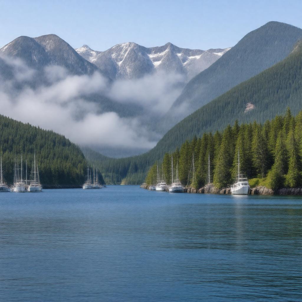 "Generate a serene and natural image of Auke Bay, showcasing its tranquil waters, surrounded by lush greenery and majestic mountains, with a few boats docked at Auke Bay Harbor, under a clear blue sky with a hint of mist, representing the bay's picturesque beauty, in a realistic style."