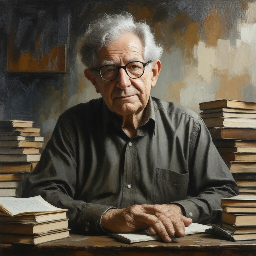 Create a realistic portrait of Avram Noam Chomsky, a middle-aged man with a distinctive appearance, sitting in a thoughtful pose, surrounded by books and papers, with a subtle hint of introspection. He should be dressed in casual, yet intellectual attire, with a warm and approachable expression. The background should be a warm, earthy tone, with hints of academia and intellectual pursuits. The style should be a photorealistic representation, with attention to detail and texture, capturing the essence of the renowned linguist, philosopher, and social critic.