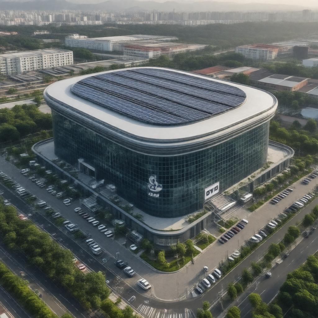 "Generate an image of the BYD Company Limited headquarters in Shenzhen, China, with a sleek and modern architectural style, surrounded by electric vehicles and solar panels, symbolizing the company's focus on renewable energy and innovative technology, with the BYD logo prominently displayed."