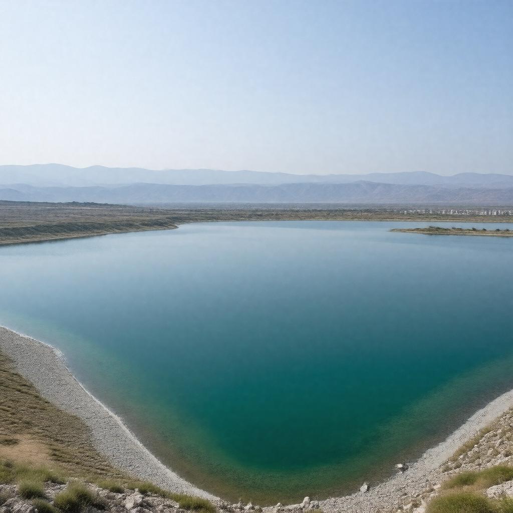 "Generate a realistic image of a large lake with brackish water, situated near the city of Baku, Azerbaijan, bordering the Absheron Peninsula, with a view that captures its serene and natural beauty, in a style reminiscent of a landscape photograph."
