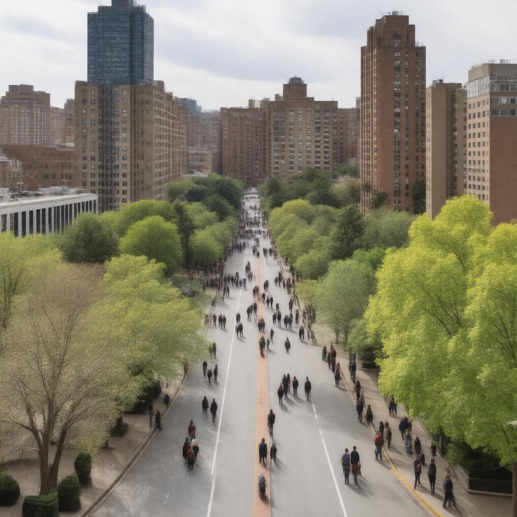"Generate an image of Ballston, a neighborhood in Arlington County, Virginia, showcasing its vibrant atmosphere with a mix of office buildings, such as Ballston Exchange and Ballston Tower, residential areas, and green spaces like Welburn Square and Quincy Park, with the Ballston–MU metro station and a glimpse of the bustling streets with people walking, in a daytime setting with a realistic style."