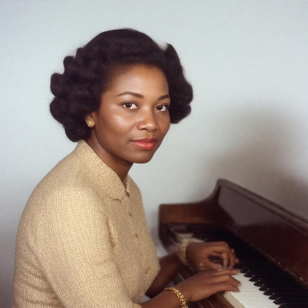 Generate a realistic portrait image of Barbara Siggers Franklin, an American singer and pianist, in a 1940s style photograph, possibly in a recording studio or at home with a musical instrument, such as a piano, reflecting her occupations, wearing attire typical of the era, with a gentle and artistic expression.