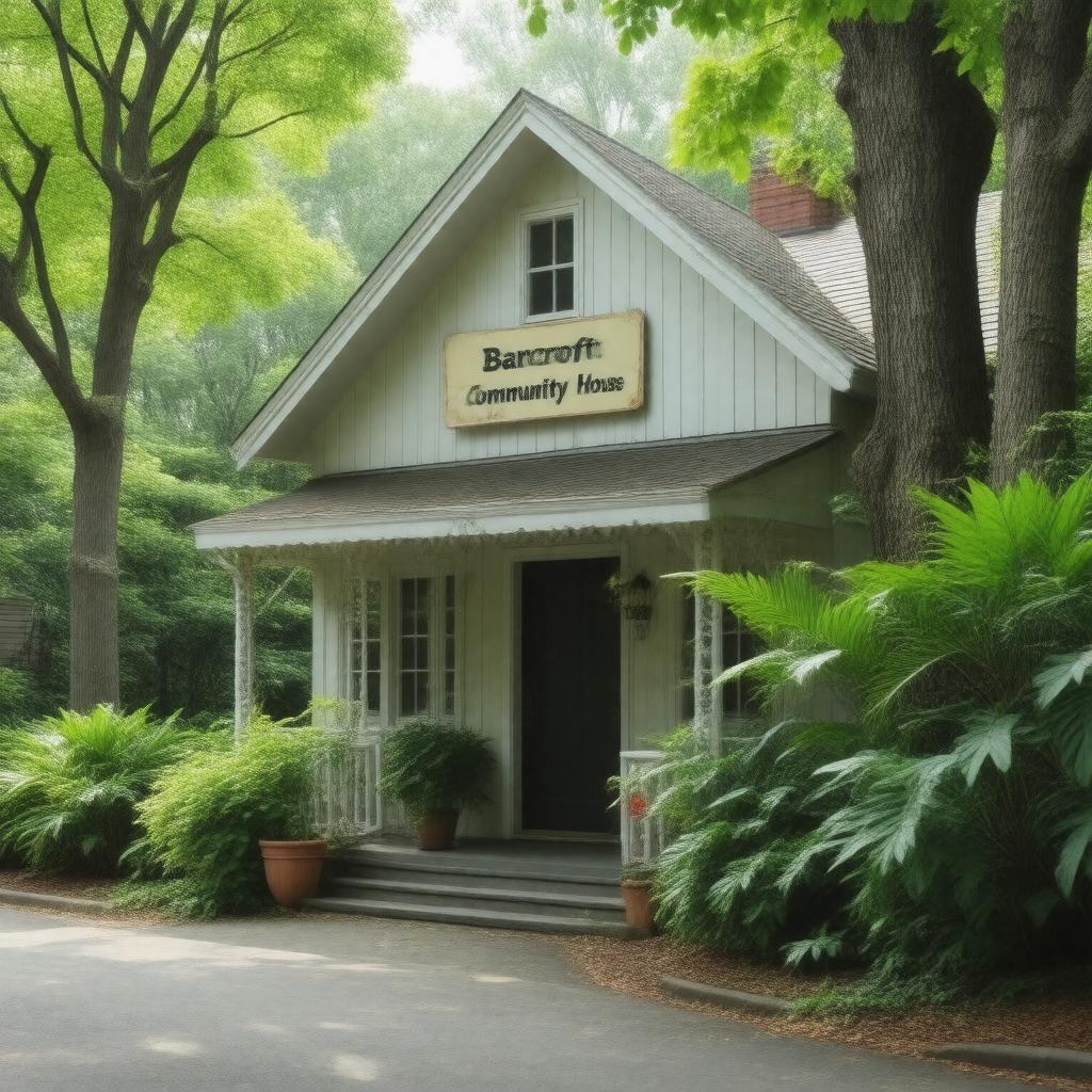 Generate an image of a serene community house surrounded by lush greenery, with a sign reading "Barcroft Community House" in a warm, inviting font, in a realistic style.