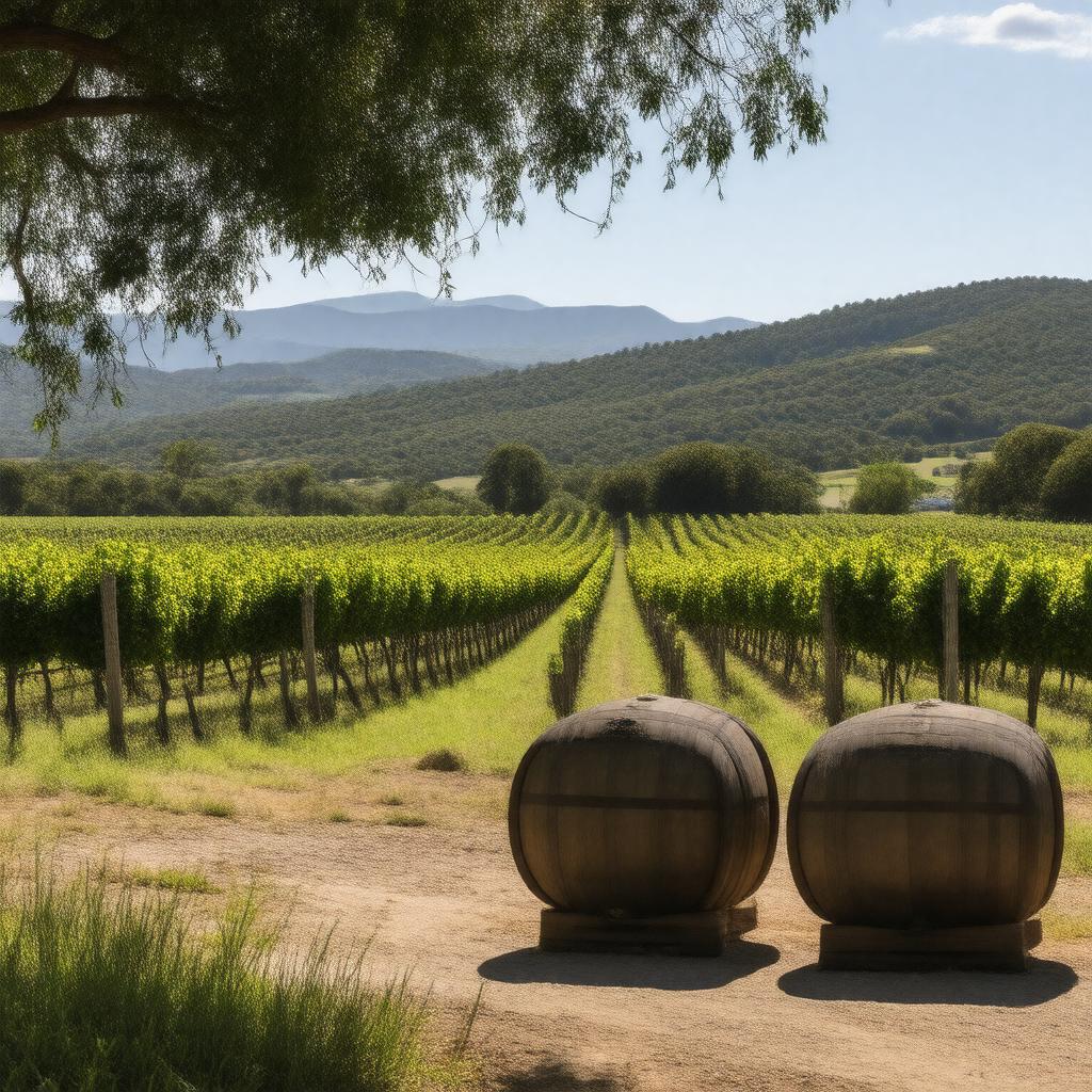 "Generate an image of a scenic view of Barossa Valley, showcasing its rolling hills, vineyards, and Mediterranean climate, with a focus on its famous Shiraz wine production, including a few wine barrels and grapevines in the foreground, and the Barossa Range in the background, under a warm and sunny day."