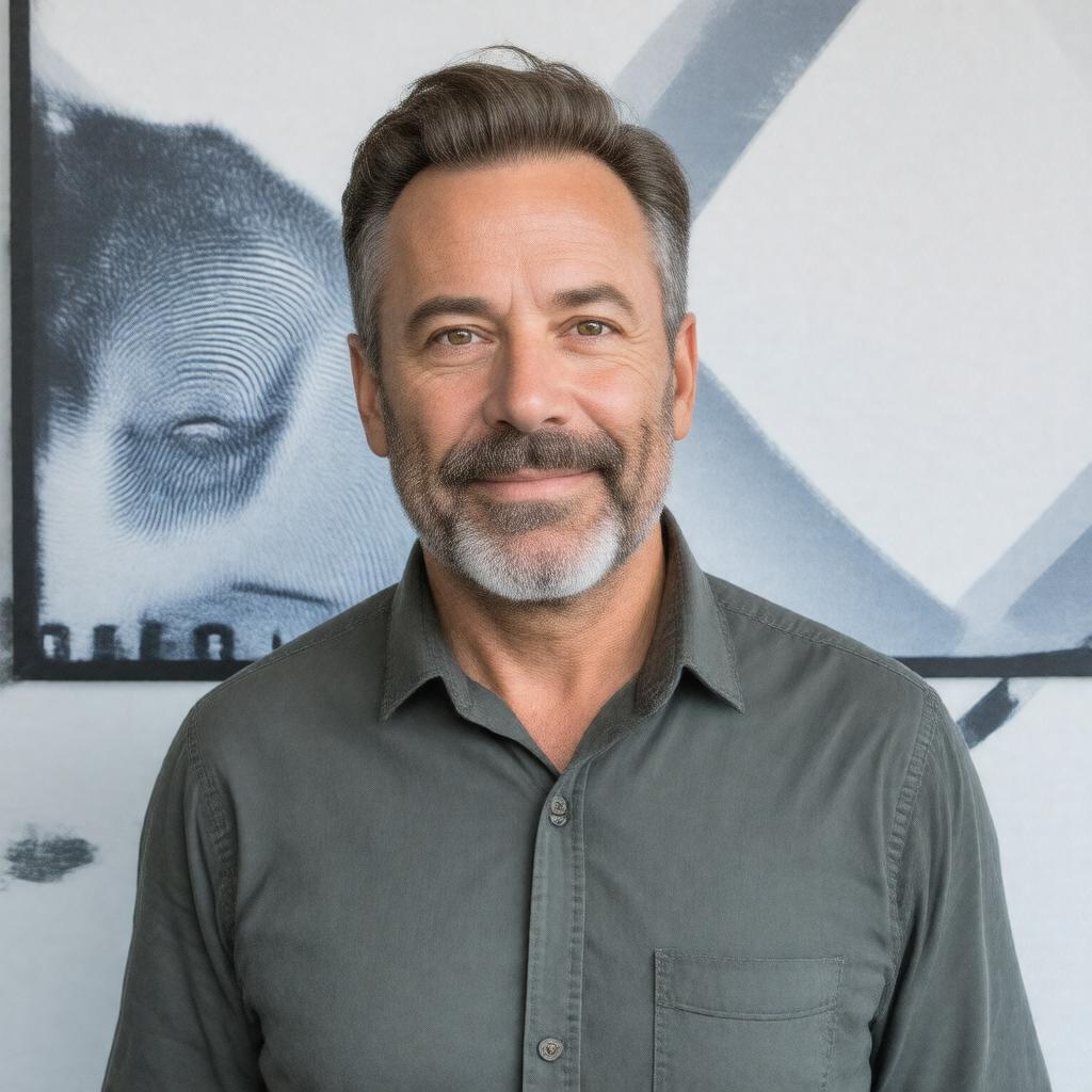 Generate a realistic portrait of a middle-aged American man, specifically a film director, born on January 17, 1970, in Manhattan, New York City, wearing a casual yet professional attire, with a gentle smile, standing in front of a cinematic backdrop that subtly hints at his notable works, such as "The Myth of Fingerprints", "Trust the Man", "Wolves", and "After the Wedding", reflecting his occupation as a film director, screenwriter, and producer, and his association with the film industry.