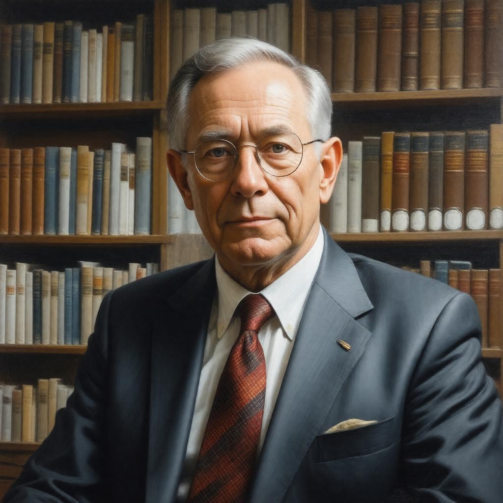 Create a realistic portrait of Baruch Blumberg, a middle-aged man with a gentle expression, wearing a suit and tie, sitting in a library or laboratory setting with books and medical equipment in the background, symbolizing his work as a physician, biologist, and researcher, with a hint of a nod to his Nobel Prize in Physics and his contributions to the discovery of the Hepatitis B virus and development of the Hepatitis B vaccine.