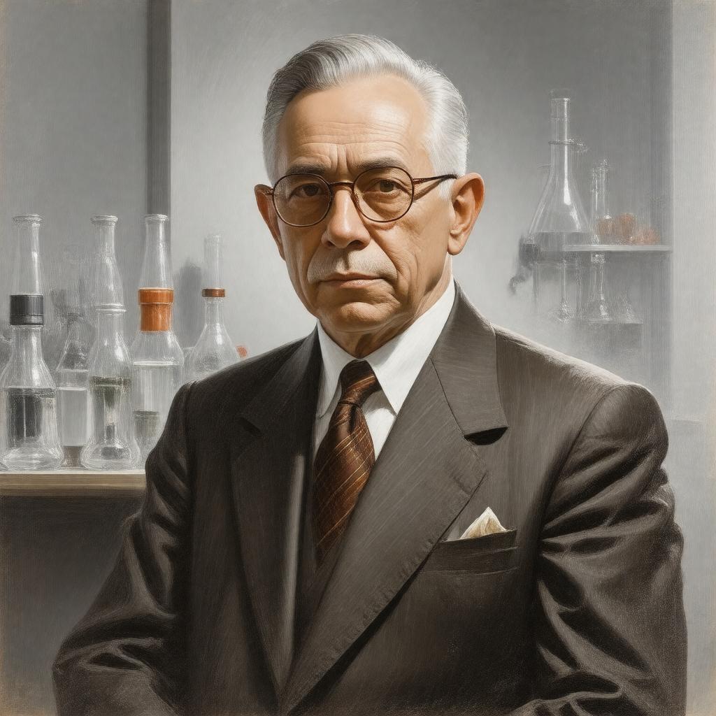 Create a realistic portrait of Baruj Benacerraf, a Venezuelan-American immunologist, in a formal setting, possibly in a laboratory or academic environment, wearing attire typical of a professor in the 20th century, with a background that subtly suggests his connection to immunology or his work on the Major Histocompatibility Complex.