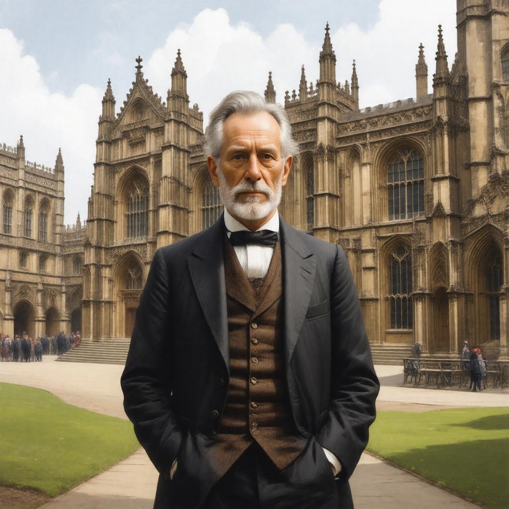 Generate an image of a late 19th-century British architect in his mid-60s, with a dignified and professional demeanor, dressed in formal attire typical of the era, standing in front of one of his notable architectural works, such as the John Rylands Library or Newnham College, Cambridge, incorporating elements of Queen Anne Revival and Gothic Revival styles, with a backdrop that reflects his connection to Oxford or Cambridge universities.