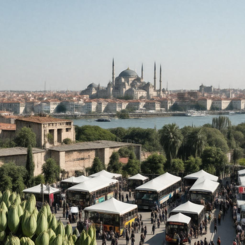 "Generate a realistic image of Bayrampaşa, a district in Istanbul, Turkey, showcasing its urban landscape, possibly with the Bayrampaşa Prison or Bayrampaşa Bus Terminal in the background, and a glimpse of the artichoke festival, set against the European side of Istanbul's scenic views."