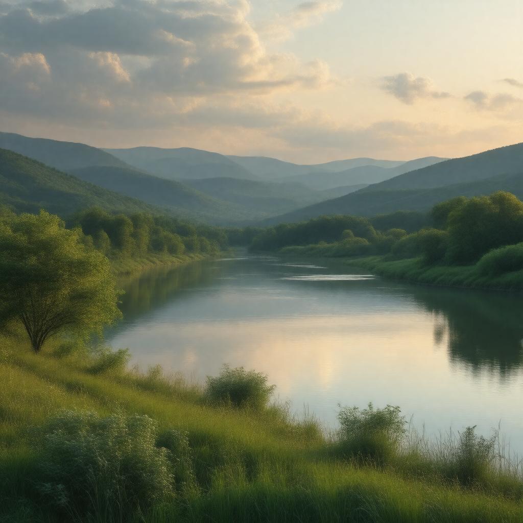 "Generate an image of a serene and picturesque landscape of Ohio, representing the 'Beautiful Ohio' song, with rolling hills, lush greenery, and a tranquil lake or river, in a warm sunset light, in a realistic style."