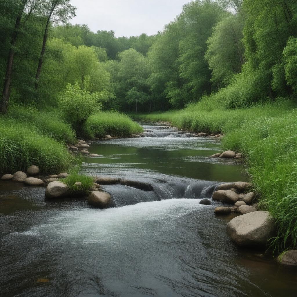 Generate an image of a serene stream, surrounded by lush greenery and trees, with a beaver dam in the background, representing Beaver Brook, a stream located in the United States, in a realistic and natural style.