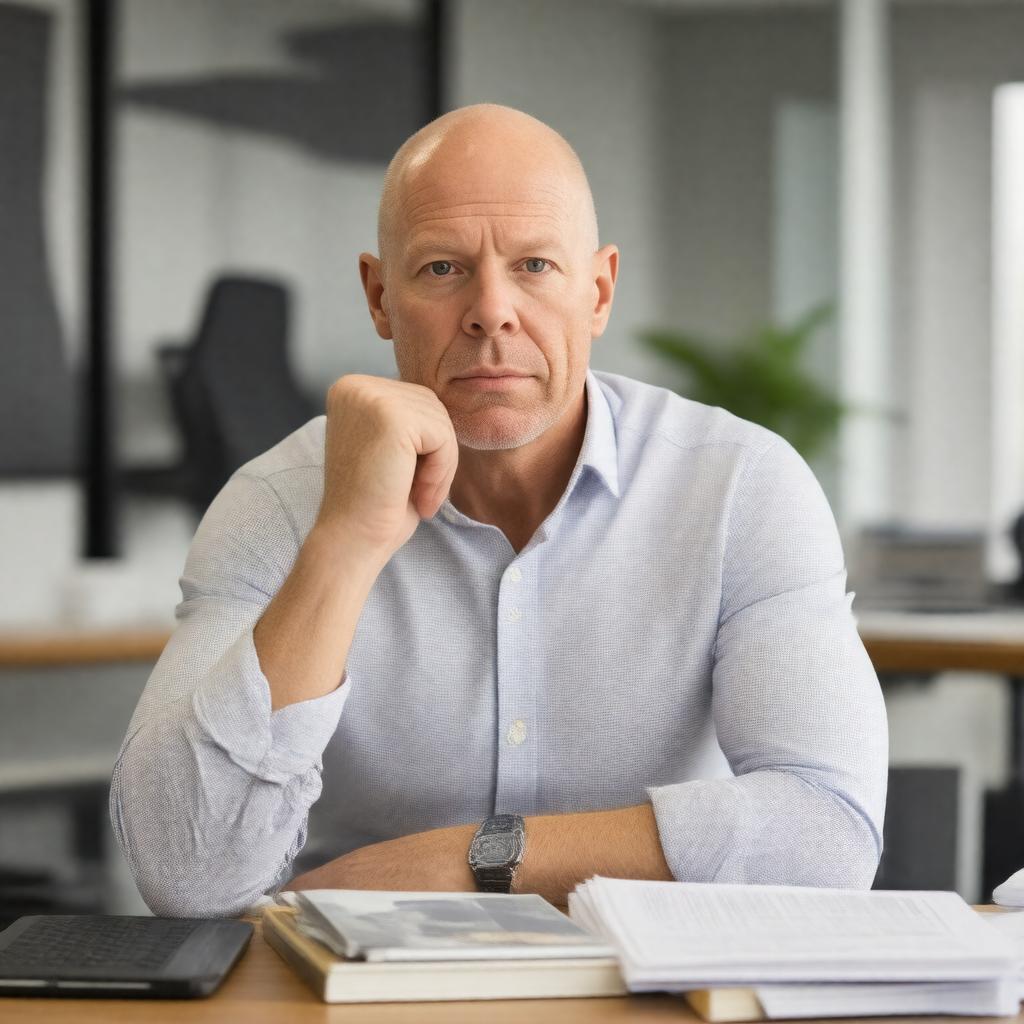 "Generate a realistic image of Ben Horowitz, a middle-aged American entrepreneur, investor, and author, sitting in a modern office with a thoughtful expression, wearing a business casual outfit, with a few books and papers on his desk, including 'The Hard Thing About Hard Things' and 'What You Do Is Who You Are', with a blurred background that suggests a Silicon Valley or California setting."