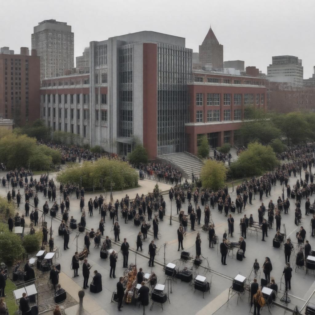 "Generate an image of a prestigious music university with a maroon and gray color scheme, situated in an urban area of Boston, Massachusetts, with a modern architecture, surrounded by musicians and music equipment, representing Berklee College of Music, a private university founded in 1945, known for its programs in jazz, contemporary music, film scoring, and more."