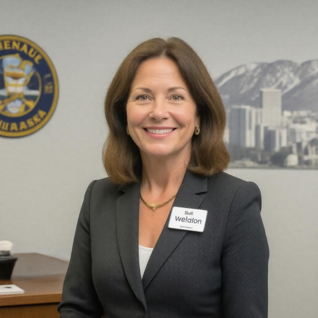 Generate a realistic image of a middle-aged American woman in a formal office setting, wearing a professional outfit and a name tag, with a subtle background of the Juneau, Alaska cityscape; she is smiling and standing in front of an official-looking desk with a mayoral seal, representing Beth Weldon, the Mayor of Juneau, Alaska.