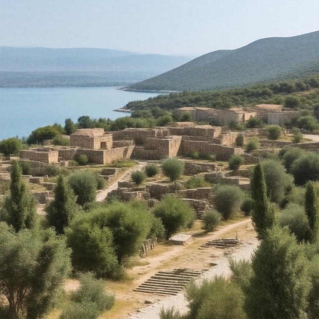 "Generate an image of the ancient city of Bethsaida, situated near the Sea of Galilee in Israel during the Second Temple period, with a backdrop of a serene lake and lush greenery, incorporating subtle hints of its significance as a miracle site and its association with Jesus and the apostles, in a realistic and historically-inspired style."