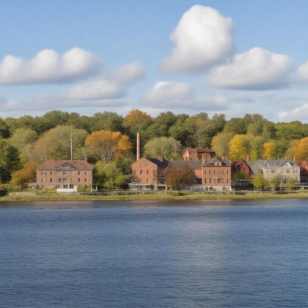 "Generate a realistic image of Biddeford, a city located in York County, Maine, United States, showcasing its scenic waterfront along the Saco River, with historic textile mills and modern buildings, surrounded by lush greenery, under a clear blue sky with a few puffy white clouds, in a daytime setting with a subtle hint of autumn foliage."