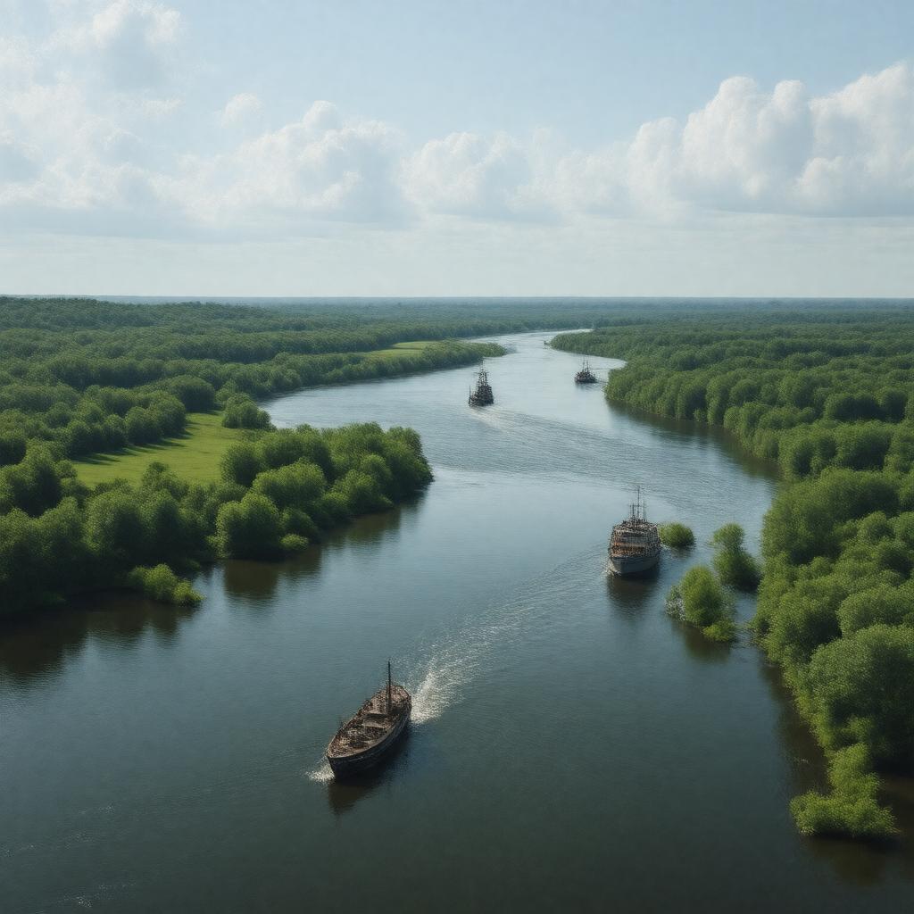 "Generate a realistic image of a serene and natural river landscape, depicting the Big Black River, a 330-mile-long river in Mississippi, United States, flowing through its winding course, surrounded by lush greenery and possibly with some boats or ships navigating its waters, in a style reminiscent of a landscape painting."