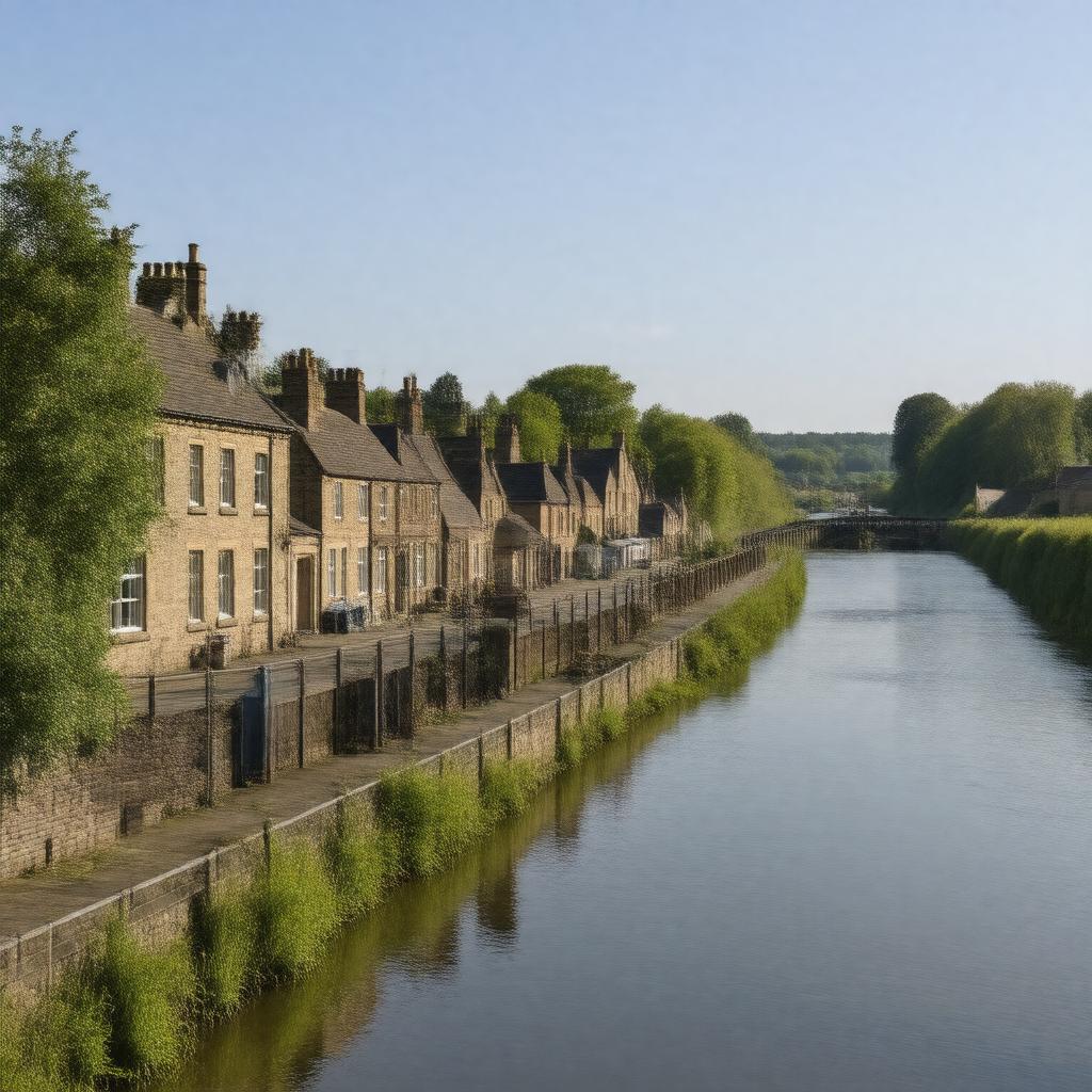 Generate a realistic image of a small town in West Yorkshire, England, with a population of around 18,494, situated along the River Aire. The town should have a railway station, a market, and a secondary school. In the background, include the Five Rise Locks, a notable landmark. The image should be in a daytime setting with a mix of old and new buildings, showcasing the town's charm and character, with a style that blends realism with a touch of serenity.