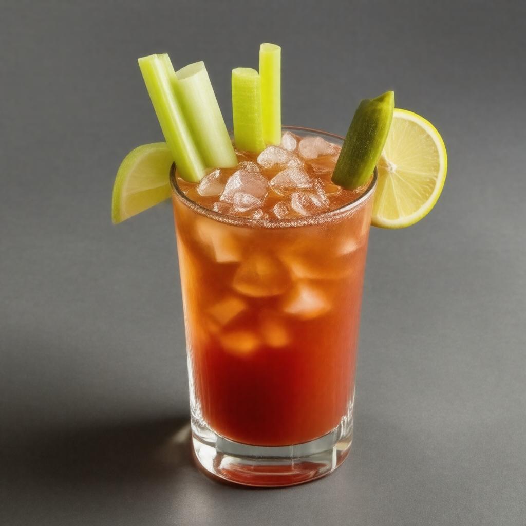 "Generate an image of a Bloody Mary cocktail, a spicy and savory drink, served in a highball glass over ice, garnished with a celery stalk, lemon wedge, and pickle spear, with a reddish color, in a realistic style, often associated with brunch in the United States and Canada."