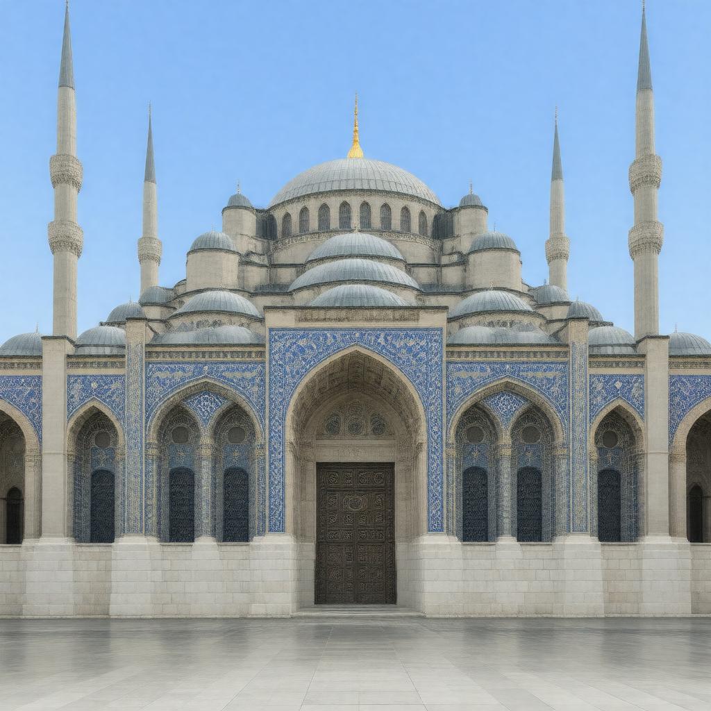 "Generate an image of the Blue Mosque, also known as Sultan Ahmed Mosque, located in Istanbul, Turkey, showcasing its stunning Ottoman architecture, large courtyard, and impressive blue tiles adorning the interior walls, with 6 minarets and 1 main dome surrounded by 8 secondary domes, under a clear blue sky."