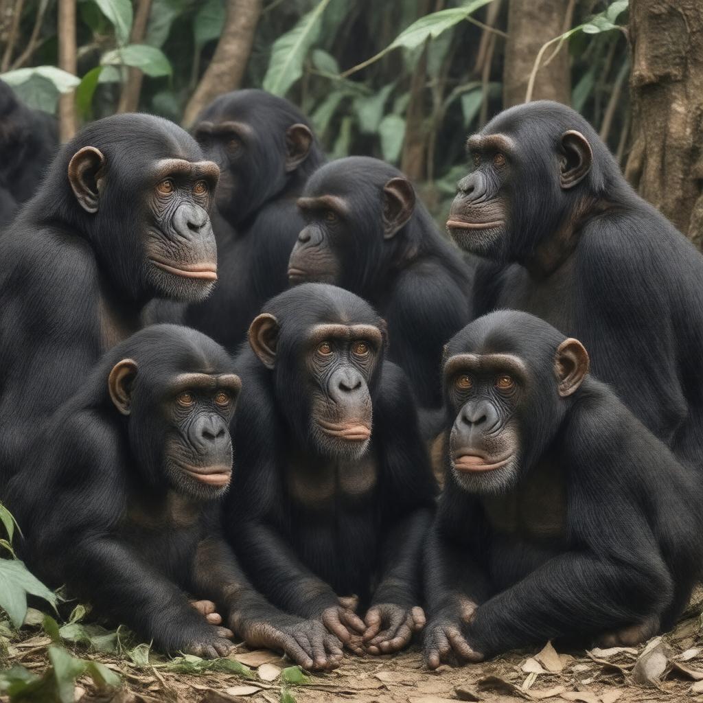 "Generate an image of a group of Bonobos (Pan paniscus) in their natural habitat, a tropical rainforest in the Democratic Republic of the Congo, showcasing their matriarchal social structure and peaceful interaction, with a focus on their expressive facial expressions and body language, in a realistic and detailed style, similar to a nature documentary."