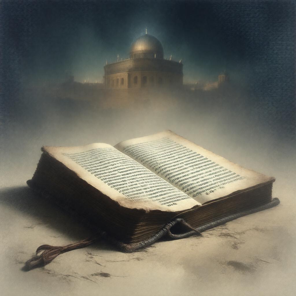 "Generate an image of a ancient, worn leather-bound book, open to a page with Hebrew script, surrounded by a dimly lit, mystical background with a faint image of the Temple in Jerusalem in the distance, representing the Book of Jeremiah, a prophetic book of the Hebrew Bible and Old Testament, with a sense of solemnity and introspection, in a style reminiscent of illuminated manuscripts."