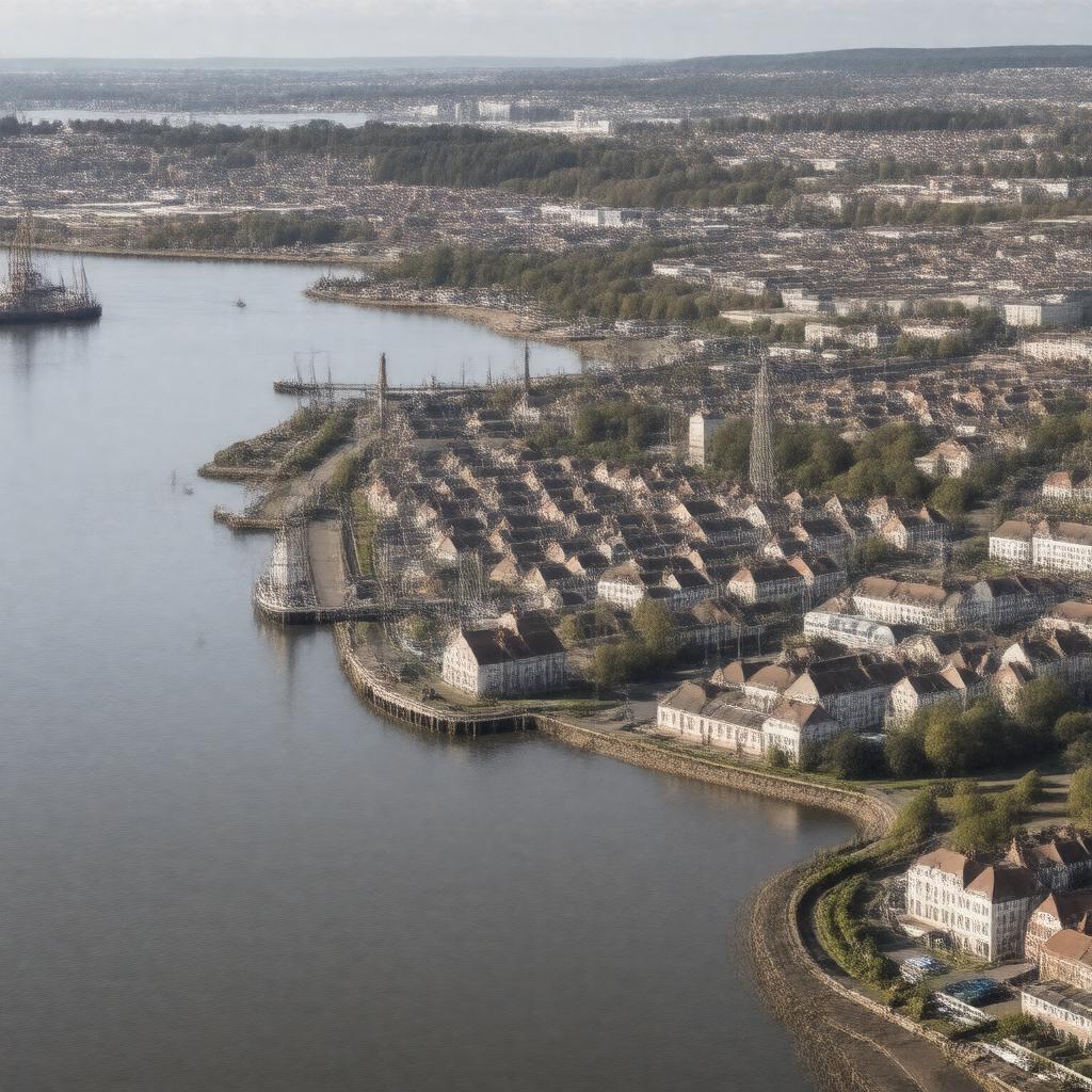 "Generate a realistic image of a bustling waterfront town in North West England, with a mix of modern and industrial architecture, surrounded by docks and close to a city centre, representing Bootle, a town with a population over 50,000, in the style of a daytime photograph."