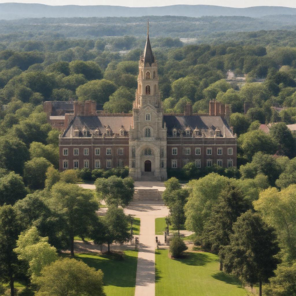 "Generate an image of Boston College, a private non-profit university located in Chestnut Hill, Massachusetts, United States. The image should feature the university's iconic campus, showcasing its suburban setting and 338-acre landscape. Include notable architectural features, such as the stunning buildings and monuments. Incorporate the university's colors, maroon and gold, in the scene. The style should be realistic, capturing the essence of the institution. Depict the campus in a serene atmosphere, possibly during the daytime with a clear sky."