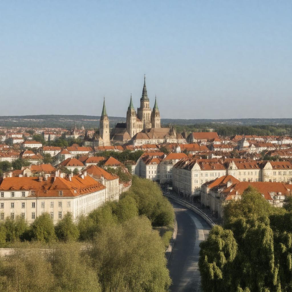 "Generate a realistic image of Brno, the second-largest city in the Czech Republic, showcasing its modernist architecture, with the Špilberk Castle and Cathedral of St. Peter and Paul in the background, and the Brno Exhibition Centre or Trade Fair area in the foreground, under a clear daytime sky with a subtle hint of the Svratka and Svitava rivers."