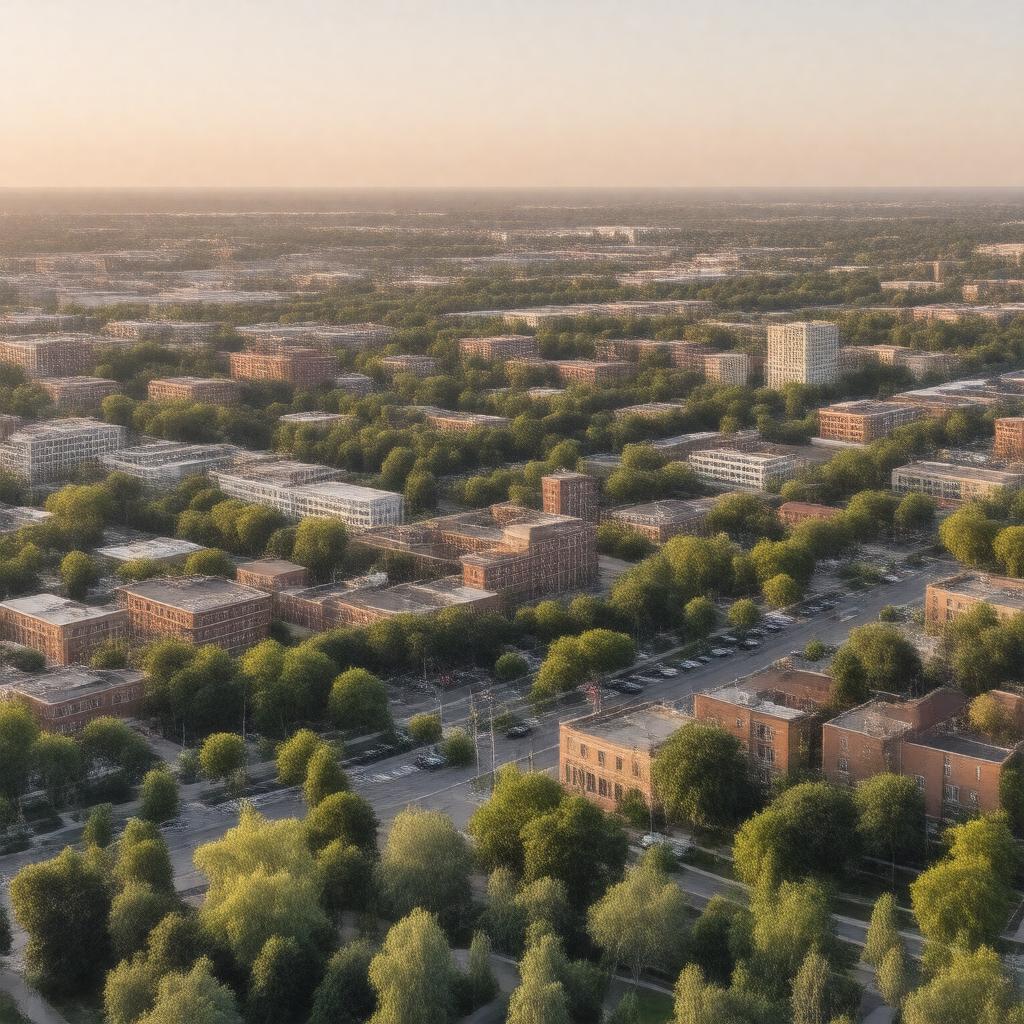"Generate a realistic image of Brampton, a city located in Peel Region, Ontario, Canada, showcasing its vibrant downtown area with a mix of modern and historic buildings, surrounded by lush greenery and a diverse community, reflecting its nickname 'The Flower City', in a daytime setting with a subtle warm glow."