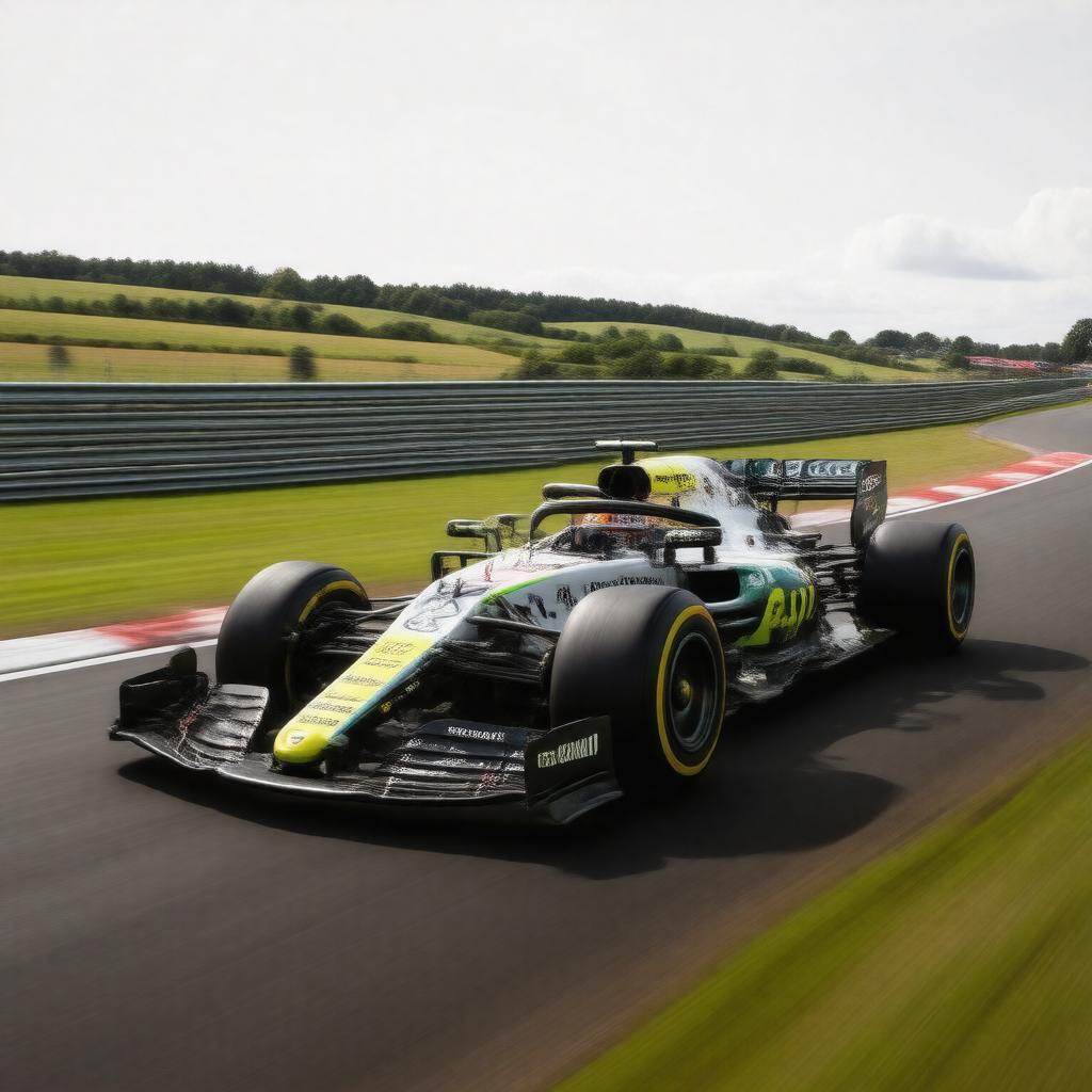 "Generate an image of a Formula One car with a predominantly white, fluorescent yellow, and black livery, representing the Brawn GP team, with the BGP 001 chassis and Mercedes-Benz engine, racing on a track with a backdrop of the Brackley, United Kingdom landscape, symbolizing the team's origins and notable achievements, including their Constructors' Championship win in the 2009 Formula One World Championship."