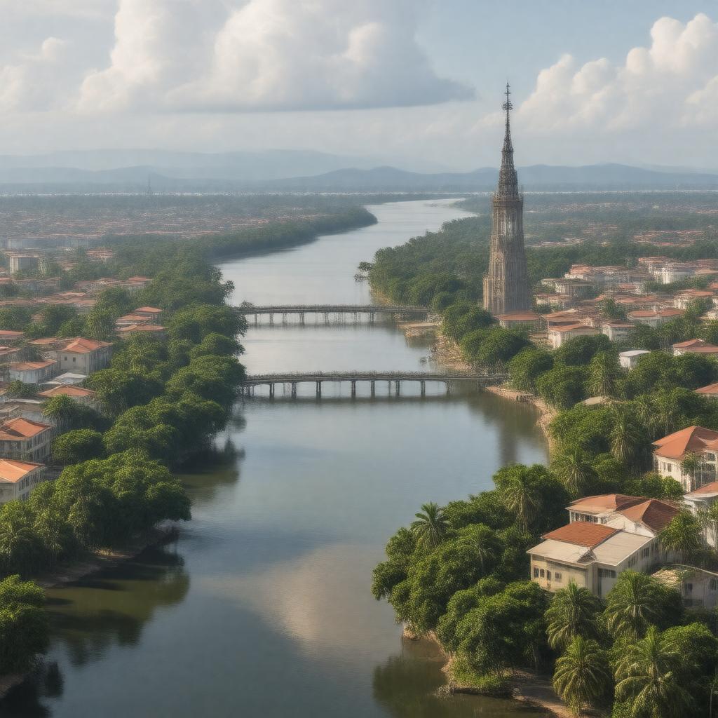 "Generate a realistic image of Brazzaville, the capital city of the Republic of the Congo, showcasing its vibrant atmosphere and iconic landmarks such as the Basilique Sainte-Anne and Nabemba Tower, with the Congo River in the background, in a style that reflects the city's tropical wet and dry climate and rich cultural heritage."