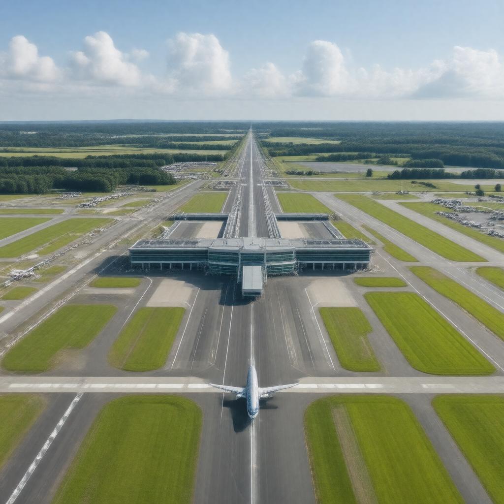 "Generate a realistic image of Bristol Airport, a modern airport located in North Somerset, South West England, with a terminal building, runway, and aircraft, surrounded by lush greenery, under a clear blue sky with a few clouds, incorporating a sense of bustling activity with passengers and airport staff."