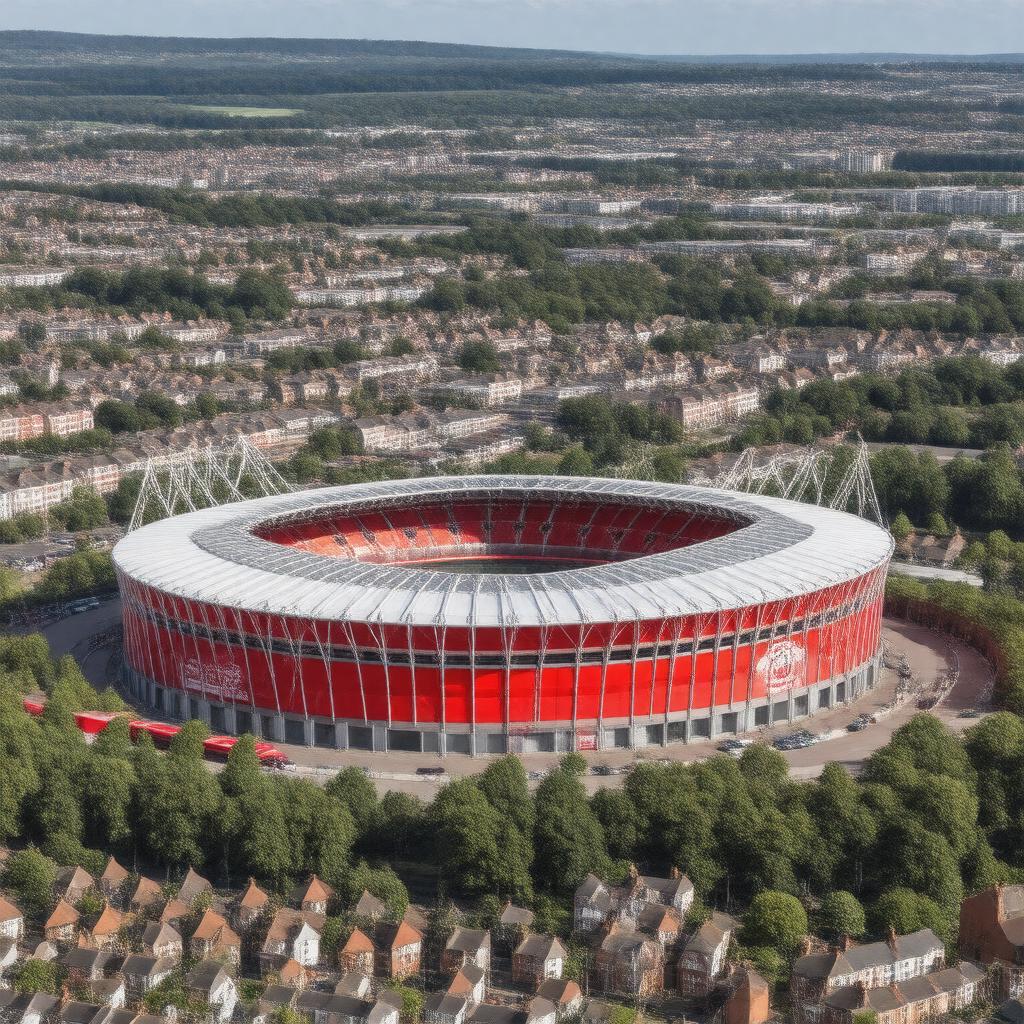 "Generate an image of Bristol City, specifically a realistic depiction of Ashton Gate Stadium, the home stadium of Bristol City Football Club, with the iconic red color of the team prominent, set against a backdrop of the Bristol cityscape, in a daytime setting with a mix of modern and traditional architectural styles."