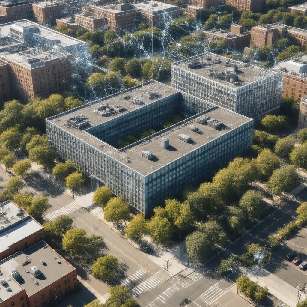 "An aerial view of the Broad Institute's campus located at 415 Main Street, Cambridge, MA, showcasing its modern architecture and surroundings, with a stylized representation of genomic data and computational biology elements in the background, symbolizing its focus on genomics, biomedical research, and computational biology."