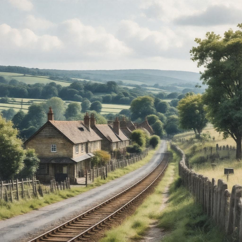 "Generate a realistic image of a small village in the English countryside, with a railway station and a cemetery, surrounded by rolling hills and trees, in a style reminiscent of a watercolor painting, representing Brookwood village in Surrey, United Kingdom."