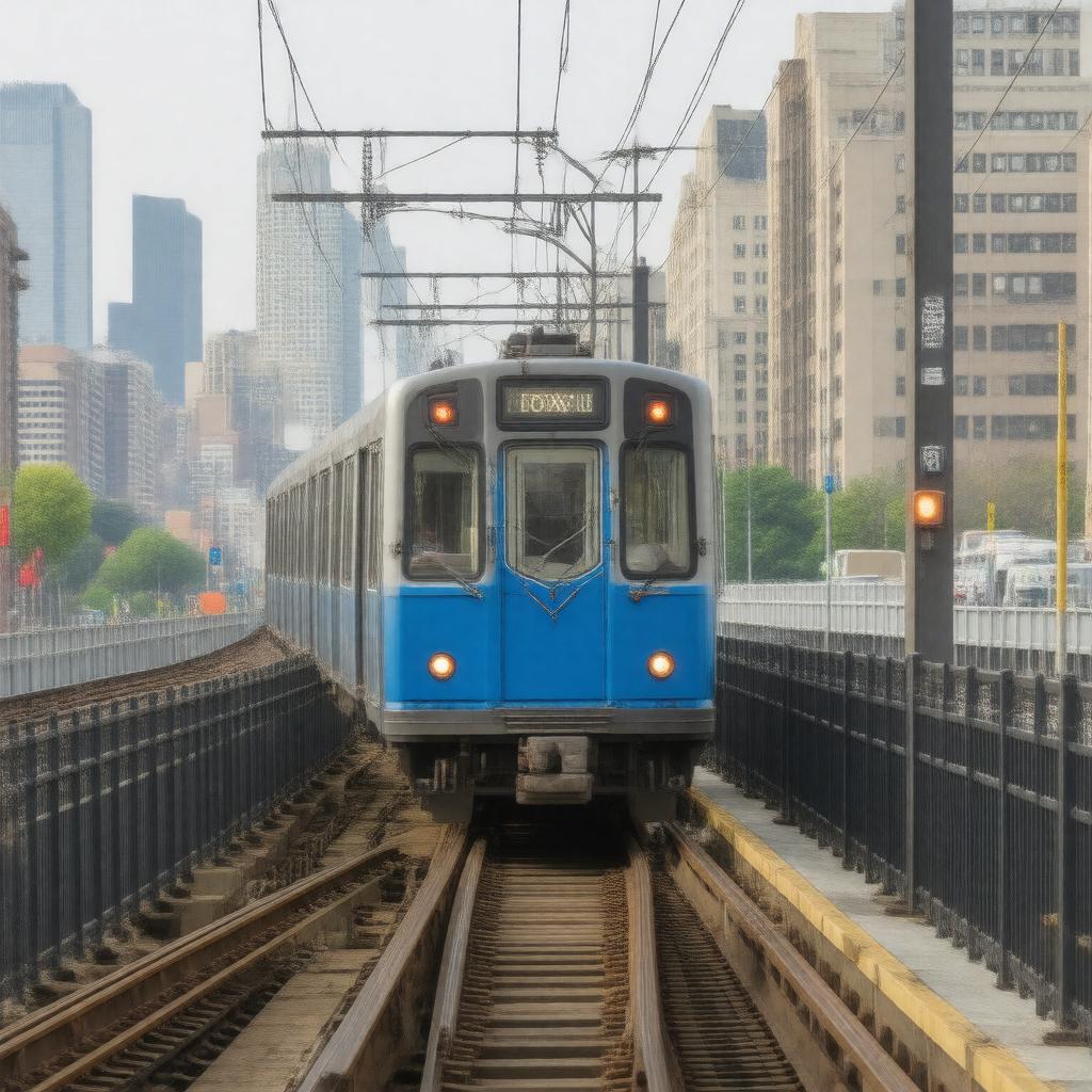 "Generate an image of a light rail train, specifically a Tokyu Car Corporation LRV, in the Buffalo Metro Rail system, with a blue color scheme, traveling on elevated tracks in Downtown Buffalo, New York, with the city's skyline and possibly some passengers in the background, under a 750 V DC overhead line, incorporating standard gauge tracks, with an urban transit atmosphere."