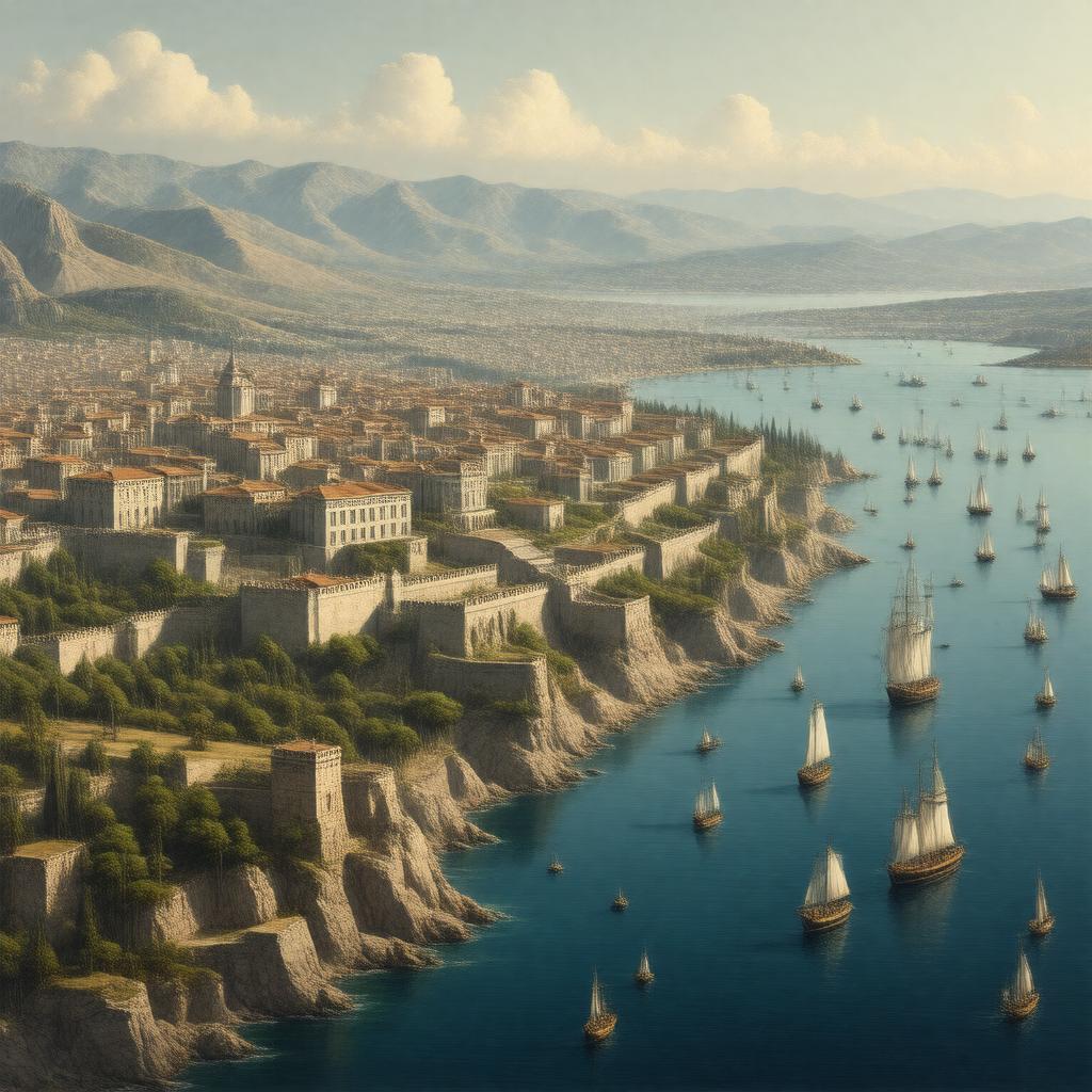 "Generate an image of a realistic ancient city situated on the banks of the Bosporus Strait, with a backdrop of the Sea of Marmara and the Golden Horn, depicting Byzantium in its prime, with defensive walls and a bustling harbor, in a style reminiscent of ancient Greek and Roman architectural illustrations."
