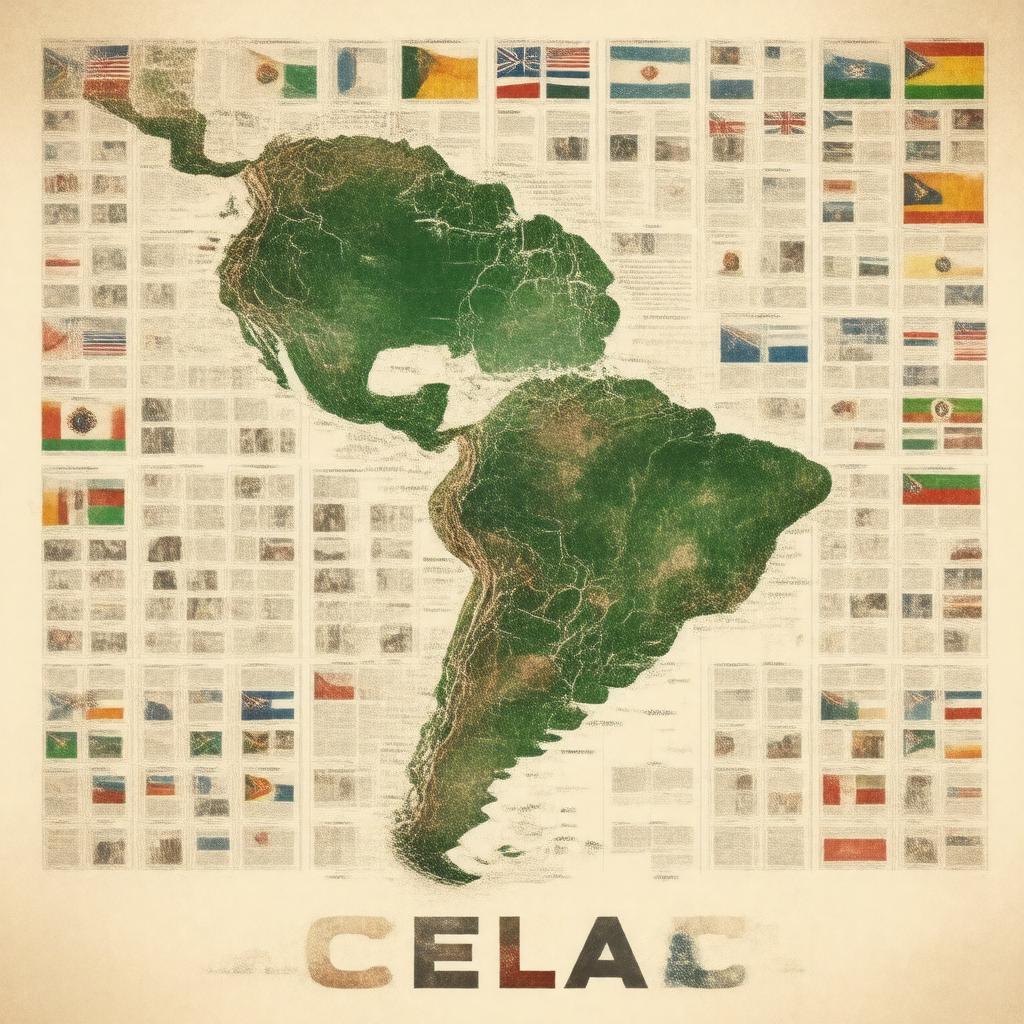 "Generate an image of the Community of Latin American and Caribbean States (CELAC) logo or a symbolic representation of regional integration and cooperation among Latin American and Caribbean countries, with a stylized map or a collage of flags from its 33 member states, in a formal and diplomatic style, with a background that reflects the cultural richness and diversity of the region."