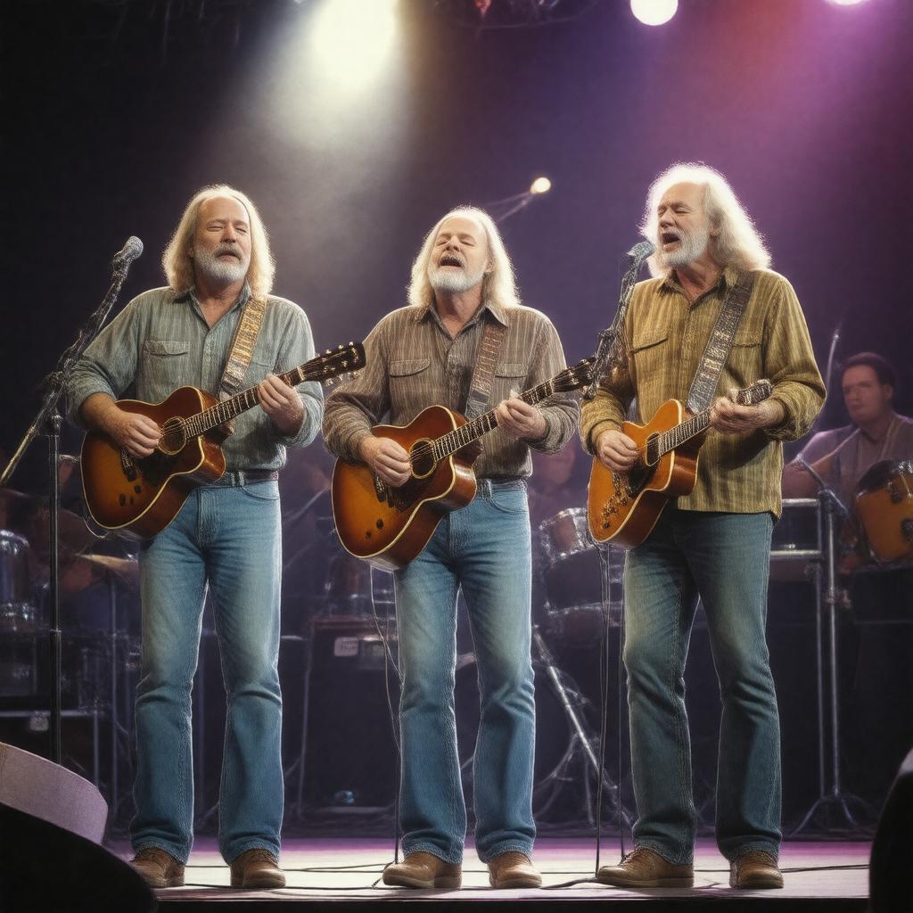 Generate an image of the American folk rock band Crosby, Stills & Nash, depicting David Crosby, Stephen Stills, and Graham Nash performing on stage with their instruments, with a nostalgic and iconic 1970s-style concert backdrop, warm lighting, and a sense of harmony and musical chemistry among the band members. The style should be a realistic representation of a live performance, with attention to the distinctive features and expressions of each band member.
