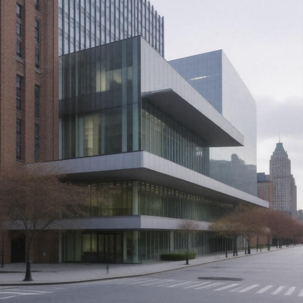 "Generate an image of the CUNY School of Law building, a modern and sleek structure, located in Long Island City, Queens, New York City, with a subtle hint of the Manhattan skyline in the background, representing a public law school with a focus on public interest law, established in 1983 and affiliated with the City University of New York."