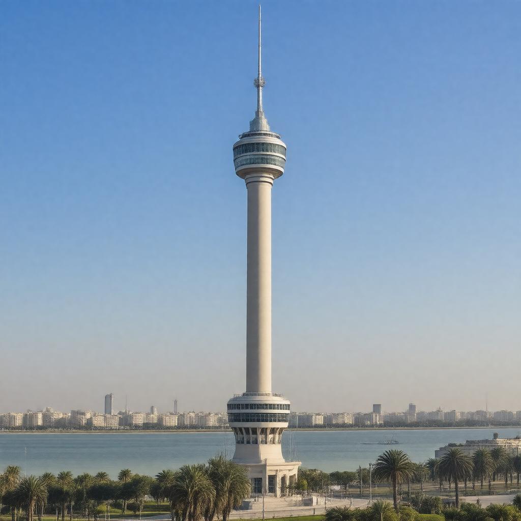 "Generate an image of the Cairo Tower, a 187-meter-tall modernist observation tower located on Gezira Island in Cairo, Egypt, with a distinctive design and a revolving restaurant at the top, set against a clear blue sky with the Nile River flowing in the background."
