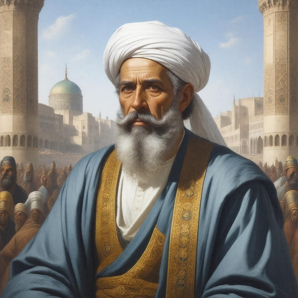 "Generate an image of Caliph Umar, the Second Caliph of the Rashidun Caliphate, depicted in a realistic and dignified manner, wearing traditional Islamic attire, with a strong and wise expression, set against a backdrop of Islamic architecture, symbolizing his role in the expansion of the Islamic Empire and his notable achievements in establishing the Islamic calendar, judicial reforms, and promoting religious tolerance."