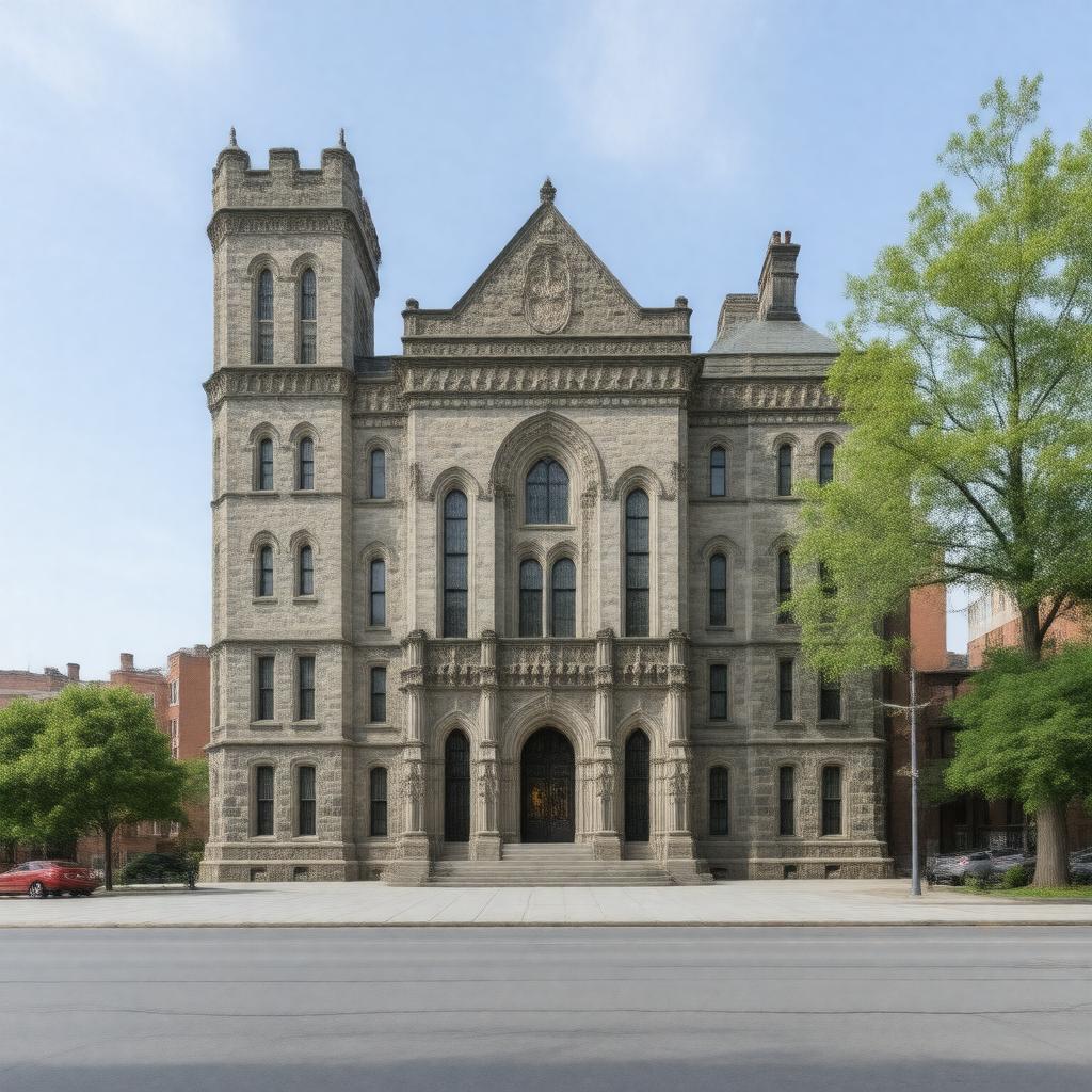 "Generate an image of Cambridge City Hall, a Richardsonian Romanesque government office building located at 795 Massachusetts Avenue in Cambridge, Massachusetts, United States, featuring a prominent castle-like structure, made of Milford granite and Longmeadow brownstone, with a height of 158 feet and 4 floors, housing the City Council Chambers, Mayor's Office, City Manager's Office, City Clerk's Office, and various municipal departments."