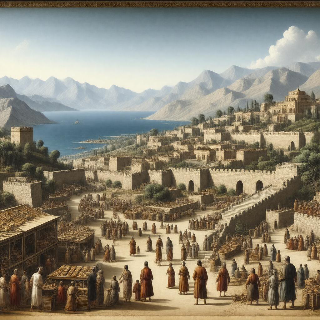 "Generate an image of a Bronze Age city-state in the region of Canaan, with a backdrop of the Mediterranean Sea and surrounding hills. In the foreground, depict a bustling marketplace with merchants trading goods, and in the distance, show the city walls and a temple dedicated to the Canaanite deity Baal. Incorporate elements of Northwest Semitic writing, such as the Ugaritic alphabet, in the scene. The style should be reminiscent of ancient Near Eastern art, with warm colors and intricate details. The image should convey the urban culture and rich mythology of the Canaanites."