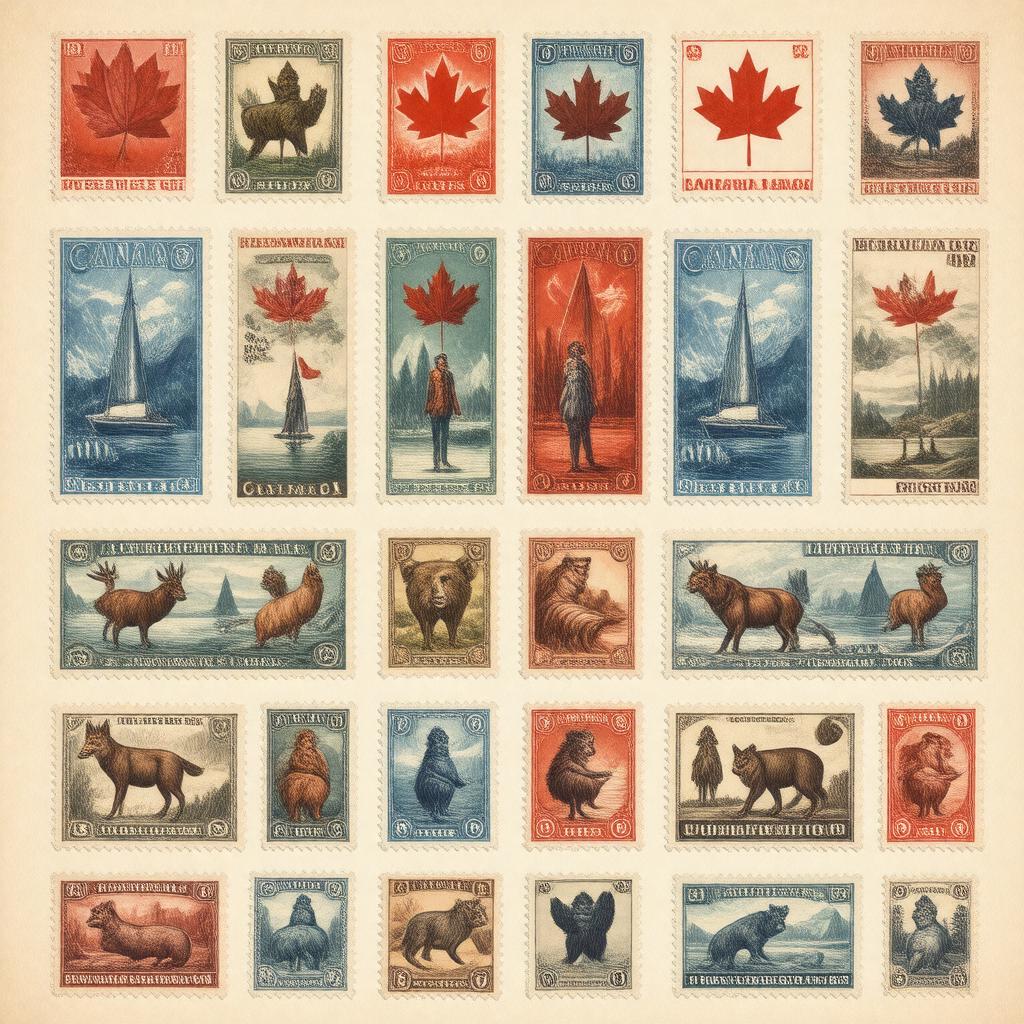 "Generate an image of a colorful Canadian postage stamp collection, featuring a mix of rectangular and square-shaped stamps with various denominations, showcasing iconic Canadian symbols such as the Maple Leaf, Bluenose, Mountie, and wildlife, set against a background that resembles a vintage postal envelope or a wooden stamp album, with a subtle texture that resembles paper or a philatelic journal."